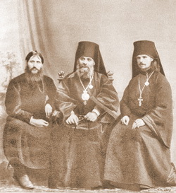 В центре – епископ Гермоген (в миру – Георгий Долганов). Предлагал отлучить от Церкви более ста русских писателей, в том числе Леонида Андреева, Дмитрия Мережковского и Василия Розанова. Слева от него – Григорий Распутин (Новых), справа – иеромонах Илиодор (Труфанов).